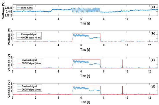 (a) Voltage output from one of the 16 tactile units; (b) result of the algorithm application using a 40 ms window for the ON/OFF signal computation; (c) result of the algorithm application using a 30 ms window for the ON/OFF signal computation; (d) result of the algorithm application using a 20 ms window for the ON/OFF signal computation. The enveloped signal was computed using a 40 ms time window in all subfigures. It is clearly noticeable, from the event detected between 9 and 10 s in the last 2 subplots, that the narrowest the window, the highest is the possibility to detect false positives.