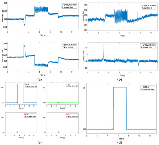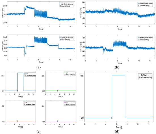 Algorithm performance plots. Panels (a,b) show the MEMS sensors output from some of the channels, one for each of the four groups mentioned in Section 3; panel (c) contains the AND mechanism results for every group; panel (d) represents the final slip signal (OR of all the ANDs).