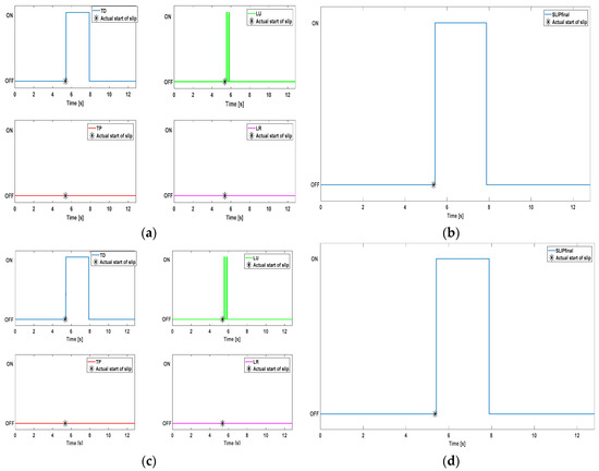 Algorithm performance for different design choices. Panels (a,c) plot respectively the AND results of the four channel groups. Panels (b,d) plot the final slip signal generated through the OR operator.