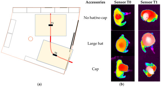 The database contains sequences in which the users were instructed on how to move under the camera in linear directions (parallel or diagonal to the captured area, to allow for proper coverage of the recording area). A top-view of the room, in which the recording took place, and some example images belonging to different classes are shown in Figure 5. In Figure 5a, T0 and T1 are the two overhead ToF cameras used to record the sequences, the color-filled rectangles show the camera field of view at the floor level, and the thick line shows the trajectory followed by the users in the recordings. In Figure 5b, the height values are shown using a color scale representation.