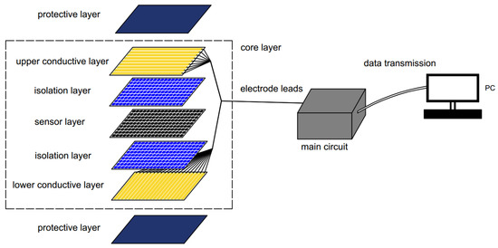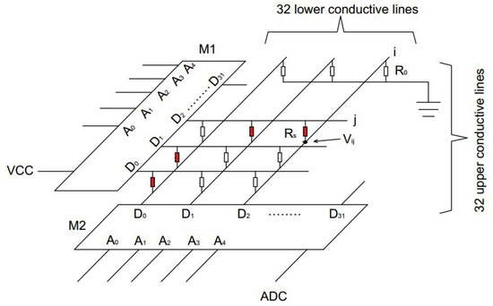 In order to obtain the high-resolution pressure distribution and other information contained in it, a large quantity of pressure sensors are implemented. In addition, for minimizing the I/O pins of the hardware circuit, a sandwiched structure consisting of three layers were utilized [16]: A 32 × 32 pressure sensor array layer and two conductive layers. The schematic of the acquisition circuit is presented in Figure 2.