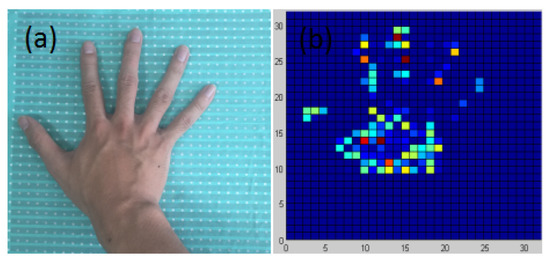 Figure 8. (a) A hand pressed on the prototype (b) The pressure distribution image of the hand.