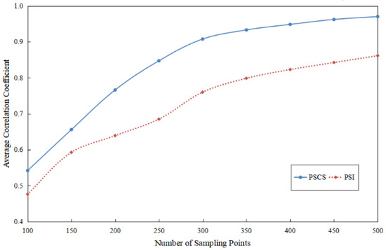 Figure 17. The change trend of the average correlation between the waves reconstructed from the PSI method with the original waves, and the average correlation between the waves reconstructed from the PSCS method with the original waves with different number of sampling points for 60 30-second epochs.