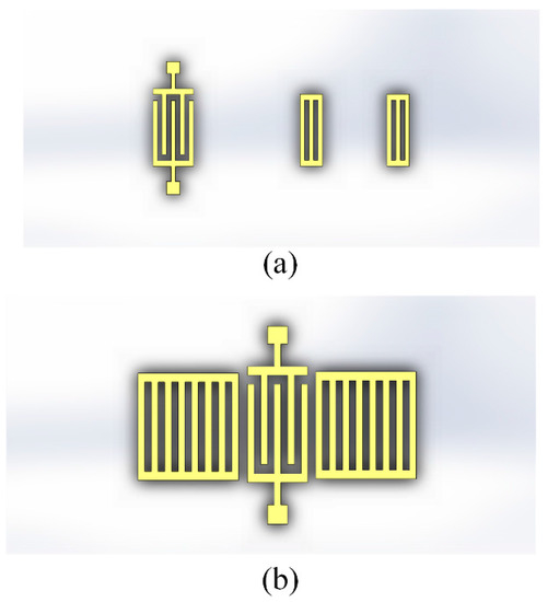 Meanwhile, wireless sensor network technology has been engaging the effort of many researchers in the past two decades [19]. It demands a large number of low power and cheap sensor nodes to build up smart intelligent grids to simultaneously monitor different parts of a desired area [20,21]. With regards to wireless sensor networks, it is essential to differentiate one particular sensor of interest from any others that might be within the range of the interrogator. Radio frequency identification (RFID) tag technology enables the unambiguous recognition of every node and simultaneous readings of many nearby ones in a vast sensor network, followed by deconvolution of the resulting signal. SAW-based RFID tags have been proposed for mass application due to their advantages of low cost, small size, low radiation power and robustness [18]. In particular, SAW tags, which can easily incorporate sensor functions, show an inherent capability for operation as sensors [22]. To date, SAW RFID built-in temperature sensors have been widely investigated with a variety of structures [23,24,25] and materials [26,27]. To date, SAW wireless and passive sensors are designed as two types of configuration as reflective delay lines and resonators, for which schematic diagrams are respectively depicted in Figure 1. The reflective delay line utilizes several reflectors located at different distances from the interdigital transducers (IDTs). The SAW covers the distance between the IDT and reflectors twice and the differential amplitude/time in time domain is measured. Some SAW sensors working at 433 MHz frequency have been reported using reflective delay line configurations [28,29,30]. However, these sensors required a wide frequency band up to 100 MHz, which massively exceeds the ISM standard. Instead, it is preferable for most 434MHz SAW wireless sensors to use the resonator scheme [31,32]. This utilized two differential resonators as sensor elements which share sensitivity to other ambient conditions but have different sensitivity levels to the desired measurement condition.