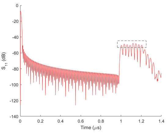where the Ts is the time position difference of the neighboring reflectors, V is the velocity of the SAWs and LIDT is the length of the IDT. The metallization ratio is designed to be a fixed value of 0.5. The aluminum thickness is set at 50 nm as a trade-off between large reflection coefficient and bulk wave suppression. In order to minimize reflectivity loss, the 8 chip BPSK-coded scheme was adopted and all reflectors were designed with open-circuit electrodes. The 180° phase was realized by shifting 1/4 wavelength of the reflector location. Aiming for the amplitudes of all echoes to be uniform, the finger number of reflectors is progressively adjusted. The IDT consisted of 21 finger pairs. The wavelength and aperture of IDT and reflectors were uniformly 1.352 and 82.50 µm. Table 1 depicts the reflector design parameters of the SAW sensor. Moreover, FEM/BEM [38,39] was used to simulate the corresponding response of the sensor, which is shown in Figure 3. Eight reflection peaks appear in the time window ranging from 1.11 to 1.21 µs, which stand for the reflections of SAW from those eight reflector gratings. In addition, several relatively weaker peaks emerging on the right are due to multi-reflections among those reflectors.