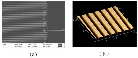 SEM (a) and AFM (b) characterisations of a section of the fabricated interdigital transducer (IDT).