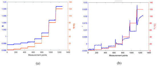 Then the sensor was tested in an oven with a temperature control accuracy of 0.1 °C. The temperature in the oven was set to eight values in the range of 0 °C to 120 °C and each temperature was held for a duration of 3 minutes. The response data was collected with one second sample intervals. Meanwhile, both s and τ parameters were calculated at each point accordingly based on the aforementioned correlation algorithm, and the results are shown in Figure 6. It is observed that s and τ both perform the expected trend subject to the change in ambient temperature. As is shown in Figure 7b, the response of τ presents more obvious disturbance, particularly at the temperature transition points. In addition, its linearity also appears much lower. In contrast, as the temperature stabilizes, the measured s response tends to stabilize and shows promising stability at the various temperatures. Also, it shows consistent shifts to the temperature transitions, as is shown in Figure 7a. Therefore, the parameter s has advantages over τ in terms of temperature evaluation.