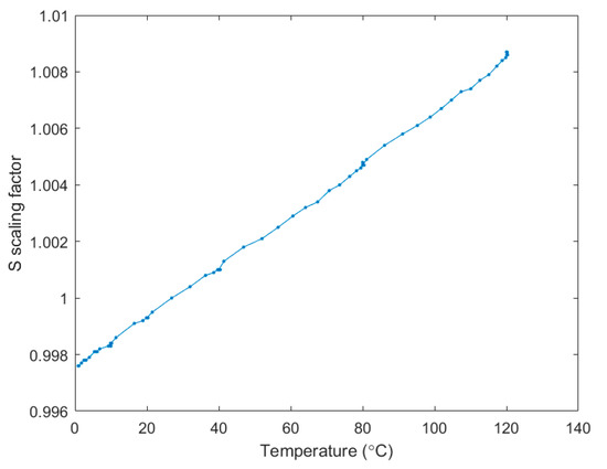 The TCD of s factor was characterised as 92.15 ppm/°C, which is close agreement with the values from the literature [13,41]. The root mean square (RMS) of the s term fitting is equal to 1.027 × 10−4, which corresponds to an RMS of temperature of 1.110 °C. Since the oven volume was much bigger than the sensor size, the display value of the oven was the average temperature inside rather than the precise value at exact location of the sensor. Besides this, the measured fluctuation is also attributed to the low level of air flow inside the oven. Despite the limitations and the unfavourable issue associated with the test oven, the good linearity and sensitivity found still prove that the scaling factor evaluation method is reliable and feasible for temperature monitoring. It also shows detection limit to very tiny temperature fluctuation in the oven as well as excellent stability.