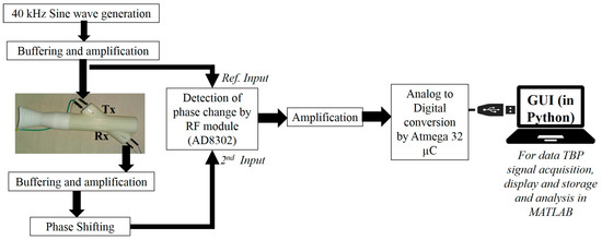 The entire device is USB-powered and uses a DC–DC converter to power the electronic boards. The 40-kHz air-coupled ultrasonic Tx is driven by a 40-kHz sine wave (generated using ICL8038) followed by a variable gain buffer amplifier. The ultrasonic Rx is similarly connected to a buffer and a variable gain amplifier followed by an active phase shifter module. This phase shifter module is used to adjust the idle (or no flow condition) operating point so that the default phase shift (due the Tx to Rx path lengths) is compensated for. The phase shifter output is fed to AD8302 (Analog Devices, Norwood, MA, USA)—the phase detector module which compares the received signal with the reference excitation signal. AD8302 (Analog Devices) is a phase-gain measurement IC targeted for operation in high-frequency regions (typically from the MHz to GHz range). It takes two inputs in pin INA and pin INB and provides gain (INA/INB) and phase (phase difference between INA and INB) information in terms of proportionate DC voltage (scaled between 0 to 1.8 V). The output from AD8302 is finally amplified (scaled between 0 to 5 V) and fed to the analog to digital converter (ADC) of an Atmega32 microcontroller (µC) which digitizes the data at 100 Hz sampling rate and sends it to a laptop/computer through USB communication.