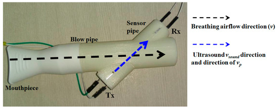 Figure 2 displays the flow-pipe which is designed in-house and is 3D printed. It consists of a main cylindrical hollow pipe fitted with a disposable mouth-piece for inhaling and exhaling. Ultrasound air-coupled transducers (one receiver and one transmitter) are kept at an angle (θ = 40°) with respect to the main blow pipe 68 mm apart, and hosted inside another hollow cylinder (sensor pipe), as depicted in Figure 2. The angle is kept at 40° to ensure maximum dynamic range coverage. The justification is given in Section 4.3.