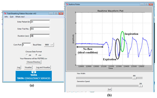 A user-friendly software interface is developed in Python. This has the provision to visualize and save the recorded data in systematic manner along with recording patient metadata (age, height and weight, trial number, trial duration) while keeping the anonymity intact. Figure 3a shows the opening page of the GUI to collect user information (meta-data) while Figure 3b shows the visualization screen. An experimenter operates the GUI to acquire the TBP signal; at the end of the data acquisition, the interface displays the computed tidal breathing parameters (extracted TBP parameters are explained in Section 5.2). The GUI is easy to operate without any medical supervision. The experimenter is needed to control the phase shifter to set the baseline at the start of the data acquisition. We now focus on actual tidal flow calculations based on our system design and the measurement principle as described above.