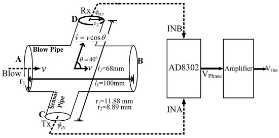where, is the distance between the ultrasonic Tx and Rx in the sensor pipe. The Tx and Rx signals are then fed to first input (INA) and second input (INB) pins of the AD8032 module, and the output voltage from AD8302 is given as (from datasheet) [48],