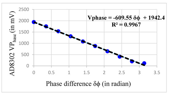 The value of G and needs to be computed in order to derive Q. In order to get , the module AD8302 needs to be tested at our operating frequency of 40 kHz. The AD8302 datasheet [37,38,39,40,41,42,43,44,45,46,47,48] presents a linear phase response in the range 0° to 180°. The datasheet indicates that the IC can uniquely measure a phase shift only from 0° to 180°, after which it wraps the phase.