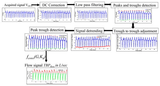 The acquired signal is in voltage from which the respiration flow rate (in L/s) is obtained according to Equation (9). The preprocessing steps are illustrated in Figure 7. The mean value of the signal is then subtracted from itself to obtain the DC-corrected signal representing the change in the blow injected by the subject. The TBP signal is contaminated with powerline interferences, body movement and other high frequency noises. To eliminate these types of contamination, a second order infinite impulse response (IIR) low pass filter with a cut-off frequency 15 Hz is applied on the DC-removed signal.