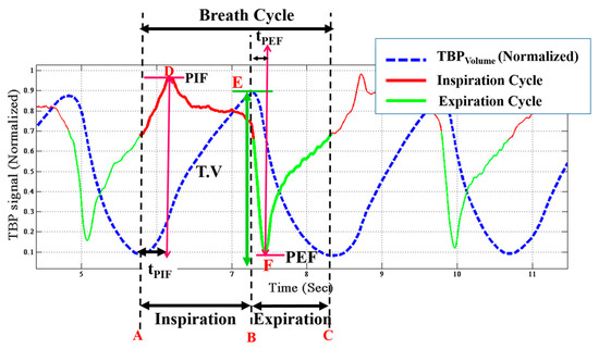 To derive the respiratory parameters, it is essential to detect the onset and end of inspirations and expirations [15]. The inspiration cycle is from the minima to the maxima while the expiration cycle is from the maxima to the next minima of the same TBPvolume. Corresponding to Figure 8, A–C is a breathing cycle, where A–B is the inspiratory cycle and B–C is the expiratory cycle. A number of independent and dependent attributes of respiratory signals are computed from the TBPvolume and TBPflow signals. These parameters [13,17,18,19,21,23,25] are described below with reference to Figure 8: