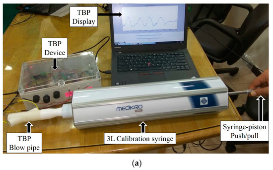 (a) The setup comprising a 3-L syringe (fitted at the mouthpiece of the blowpipe) in series with a TBP sensor during the calibration phase; (b) variation in the output of TBP device (VOUT) during slow, medium and fast rate of syringe-piston push (EXP expiration) and pull (INSP: inspiration).