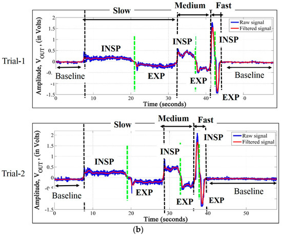 Our system is calibrated using standard 3-L syringe (Medikro 3000 [50]), used for calibrating spirometers, for various ranges of flow rates. The TBP sensor developed by us relies only on tidal breathing acquisition and analysis. It is known that during tidal breathing, the tidal volume varies around 300 mL–2 L [52]. The calibration setup is depicted in Figure 9a. The TBPR blow pipe is attached to the calibration syringe and the complete setup is kept at rest on a steady horizontal platform. The piston of the syringe is pulled out (≈inspiration) and pushed in (≈expiration) manually at three different speeds (slow, medium and fast) i.e., varying the average flow rate. We have carried out three trials of syringe expirations and inspirations for each of the three flow rates. Figure 9b visually illustrates the variation in the output voltage (VOUT) of our TBP device for the three different flow rates. Table 1 presents the area under the curve (AUC) (averaged over three trials), in volt-seconds, obtained by integrating the VOUT signal during expiration (EXP) and inspiration (INSP) for all the slow, medium and fast flow rates. It can be observed from Table 1 that there exists minimal difference between the AUC during inspiration and that of expiration, the maximum of which is found out to be 160 mL.
