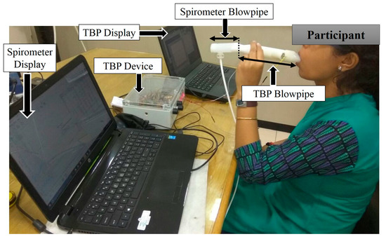 Subject breathes through the blowpipes of TBP and spirometer (connected in series) during the system validation phase.