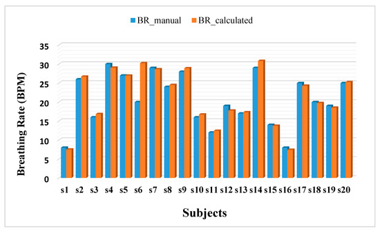 Figure 11 depicts the breathing rates (breaths per minute, BPM), of each subject computed from the TBP signal (BR_calculated) and counted manually by the experimenter (BR_manual). Both these parameters are represented as averaged over all the trials per subject. It is observed that the percentage error over all the subjects is 3.39%. This implies the correctness of the TBP device.