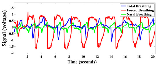 Tidal, forced, and nasal breathing acquired by the developed TBP device.