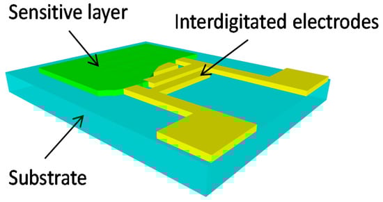 The concept of the sensor is based on the resistive transduction principle, which consists in the deposition of a TiO2-based sensitive layer on interdigitated electrodes (IDE) previously patterned on a flexible substrate (Figure 1). PET substrate was chosen as a flexible building block for the sensor design, because this material is biodegradable, cost effective, and widely available. The underlying principle of the sensor’s operation lies in fact that the absorption of water molecules by the sensitive film results in an increase of the film’s electrical conductance. The conductance change as function of the humidity level can be easily quantified by measuring the resistance between the interdigitated electrodes.