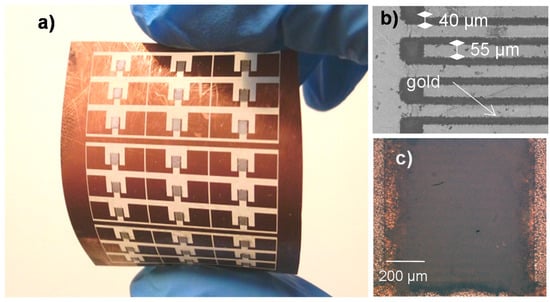 In the case of resistive-type sensors, the size of a device depends mainly on the surface area covered by the electrodes. Low-cost printing technologies such as ink-jet or screen-printing are forecasted to dominate the printed electronics era, since they allow high-volume production [15,16]. However, for electrode designs, the line resolution/width achievable by printing technologies cannot reach micro-scale features generally higher than 100 μm, resulting in a large surface area. Thus, alternative technologies need to be considered to obtain miniaturized devices. Photolithography coming from expensive CMOS (Complementary Metal–Oxide–Semiconductor) technologies allows the design of micro-scale electrodes with high resolution in a large-scale manner, and this technology can be also employed for the mass production fabrication of sensors on flexible substrate [17,18,19,20]. Nevertheless, chemical and baking steps are required in photolithography, which limits it to chemically resistant substrates such as polyimide.