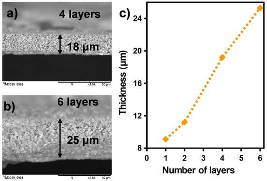 The thickness of the TiO2 can be controlled by the number of printed layers. Indeed, Figure 4a,b represents a cross-section of the TiO2 film after the printing of four layers and six layers, where the thicknesses were measured to be approximately 18 μm and 25 μm, respectively. The evolution of the thickness as function of the number of printed layers is summarized in Figure 4c.