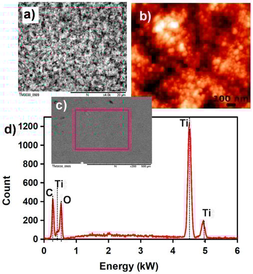 The sensing properties are based on the change in the electrical conductance of the sensitive layer with the adsorbed water, which depends on the surface characteristics of the film. The surface morphology of the TiO2 film was investigated using SEM and AFM techniques. Figure 5a shows the SEM image of a TiO2 layer with high magnification, where the porous structure of the TiO2 film can be observed, which is favorable for water vapor absorption due to the large surface area [39]. Figure 5b shows an AFM image of the TiO2 film, where the spherical structure of the TiO2 nanoparticles with a grain size of less than 100 nm, and the porosity of the film, can be clearly observed. Also, we can see in Figure 5d that the film formed by TiO2 after screen-printing is quite uniform and homogeneous along the sensor. Next, an energy dispersive X-ray spectrometer (EDX) was employed to study the structural composition of the printed titanium dioxide film. Figure 5c shows the EDX spectrum of the selected area shown in Figure 5d, where the main peaks correspond to titanium and oxygen, indicating that the surface is well covered with TiO2. The presence of carbon can be clearly observed, and it has been attributed to organic components of the functional paste. Note that, among them, an important component is the binder (hydroxypropylmethyl cellulose), since it assures a strong binding between TiO2 nanoparticles and a good adhesion of the TiO2 film with the substrate, improving the stability of the TiO2 film.