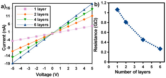 Current against voltage (I–V) characteristics of (a) the devices with different numbers of printed TiO2 layers; (b) resistance of the TiO2 as function of the number of printed layers.
