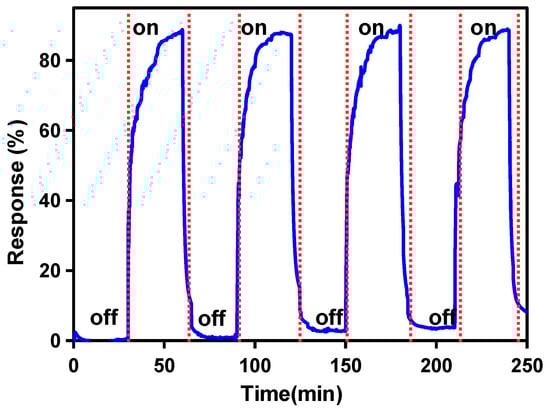 Reproducibility is one of the first requirements for a sensor’s application. Typically, it is defined as a condition wherein the sensors exhibit multiple vapor adsorptions/desorption behaviors under cyclic operating conditions. In order to examine this, the humidity environments of the sensor were sequentially changed from 0 to 70% in periods of 30 min for several sorption and desorption processes. Figure 7 reveals that during the fourth response/recovery cycles, the sensor response shows a good sensing repeatability during cycling tests, which represents another advantage for its potential application. However, a drift of about 8% in the initial value of the response can be observed in Figure 7. This was attributed to residual moisture that had accumulated in the TiO2 film after several sorption and desorption processes. Indeed, the highly porous structure of the TiO2 film highlighted in Figure 5a,b can easily trap moisture, producing the observed drift in the measurements.