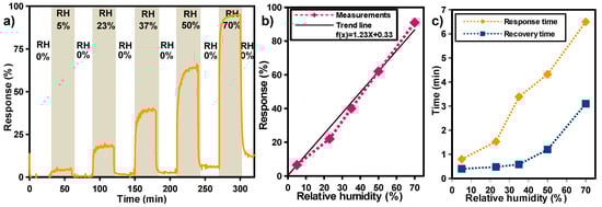 (a) response curve of the sensor to gradually increased humidity levels, ranging from 0 up to 72%; (b) sensor response as function of the relative humidity; (c) response and recovery time of the sensor as function of the relative humidity.