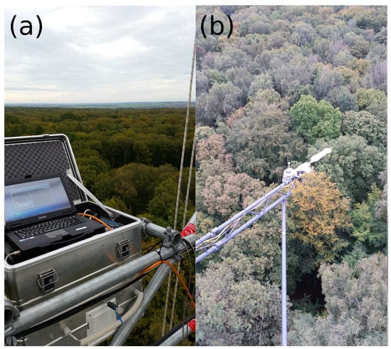 We collected data at the forest site ‘Hohes Holz’ (52.08 N 11.22 E), which is situated in central Germany near the Harz Mountains in a temperate climate [29]. The site is part of the interdisciplinary and long-term research programs Tereno (Terrestrial Environmental Observatories [30]) and ICOS (Integrated Carbon Observation System [31]). The ecosystem of ‘Hohes Holz’ is a deciduous forest with a size of around 15 km. The vegetation within one MODIS pixel around the tower consisted of 50% oak, 45% beech, 2.5% birch and 2.5% clearings, whereas the area within 30 m around the tower had a higher amount of clearings (10%) and birch (4%) and less oak (44%) and beech (42%). The eddy flux tower has a height of 50 m, which is about 20 m above the canopy. We installed one hyperspectral sensor and two multispectral sensors at the site: a QE65000 (Ocean Optics, Dunedin, FL, USA) and an SKR1850 4-channel sensors (Skye Instruments Ltd., Llandrindod Wells, Powys, U.K.).