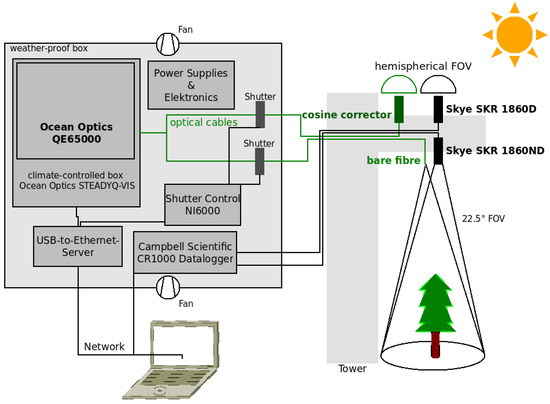 - Drolet, G.; Wade, T.; Nichol, C.J.; MacLellan, C.; Levula, J.; Porcar-Castell, A.; Nikinmaa, E.; Vesala, T. A temperature-controlled spectrometer system for continuous and unattended measurements of canopy spectral radiance and reflectance. Int. J. Remote Sens. 2014, 35, 1769–1785. [Google Scholar] [CrossRef]