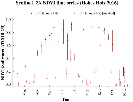 We used spectral data from MODIS datasets MYD09GQ [34] and MOD09GQ [35] with a spatial resolution of 250 m, as well as Sentinel-2A Level 1C (L1C) data [36] with spatial resolutions of 10 and 20 m. Sentinel-2A L1C data were atmospherically-, terrain- and cirrus-corrected with Sen2Cor (Version 2.3.0) [37] and ATCOR 2/3 (Atmospheric & Topographic Correction for Small FOV Satellite Images, RESE®, Version 9.1) [38] in order to generate Level 2A (L2A) data. Both processing tools generate scene classifications to distinguish between clear pixels and clouds, shadows and saturated pixels. We continued the study with ATCOR 2/3 (and without Sen2Cor) due to the higher number of successfully-processed scenes with clear sky conditions. ATCOR 2/3 could process 47 out of 78 scenes without error messages. The remaining scenes could not be processed due to the solar zenith during acquisition exceeding 70, software problems or less than one percent of clear pixels. ATCOR 2/3 detected 22 scenes as ‘clear’ around the site ‘Hohes Holz’, while eleven of them showed clouds or shadows after manual examination.