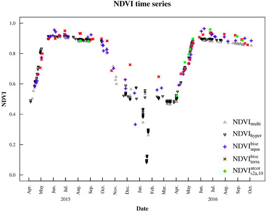 Sentinel-2A images are currently available as Level 1C products. Atmospheric, cirrus and terrain corrections are necessary for further analysis. The processing tool ATCOR 2/3 produced reasonable Level 2A products. Although ATCOR 2/3 provided scene classification information supporting the elimination of outliers, misclassifications compromised the resulting NDVI time series. Three approaches can be distinguished eliminating faulty records in time series: images can be manually examined, but this is not feasible for long time series or large datasets. The usage of diffuse shortwave pyranometer measurements as selection criteria is also limited to observation sites with respective infrastructure, but these measurements are getting more and more common. Dynamic filter algorithms, such as BISE, reduce the risk of including false observations while being applicable to large datasets without the need for auxiliary site-specific measurements. Here, BISE was able to consistently remove faulty NDVI values. Daily MODIS NDVI values of 250 m lack scene classification information and respective analysis consequently requires the use of filter algorithms. BISE was able to restore the NDVI profile, although we detected mismatches with ground data during fall 2015 and winter 2015/2016. During December 2015 and January 2016, low temperatures, precipitation events and subsequently snow cover and frozen surfaces led to a strong decrease in multispectral and hyperspectral, as well as MODIS Aqua NDVI not related to vegetation. A strong increase in NDVI during the snow-melt period was detected, which is consistent with other studies observing NDVI of snow-covered vegetation [11,19]. The length of this situation exceeded the sliding period of BISE parametrization. Consequently, decreased MODIS Aqua NDVI values were not eliminated. In contrast, MODIS Terra NDVI increased during winter 2015/2016, relating to the previously-mentioned angular effects.
