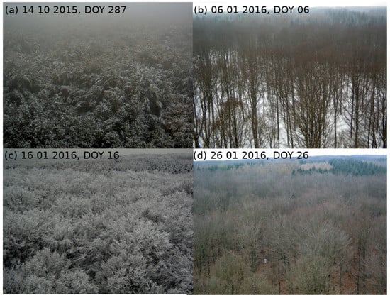 Pictures of the area around the eddy flux tower ‘Hohes Holz’. (a–d) are captured at different dates, ranging from 14 October 2015–26 January 2016. (a) shows the canopy covered by snow and ice in fall 2015. (b) shows snow cover of soil seen through a leafless tree canopy. In (c), the tree canopy is covered by ice, while (d) shows the area after a melting event (no snow or ice left).
