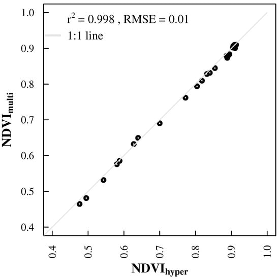Scatter-plot of NDVI derived from the hyperspectral sensor system () vs. NDVI from the multispectral sensor system ().
