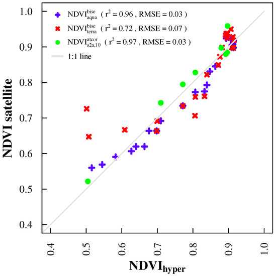 Scatter-plot of NDVI derived from the hyperspectral sensor system () and satellite NDVI products (NDVI satellite). Satellite NDVI products include (blue), (red), as well as (green). and are not shown due to large similarities with and , respectively.