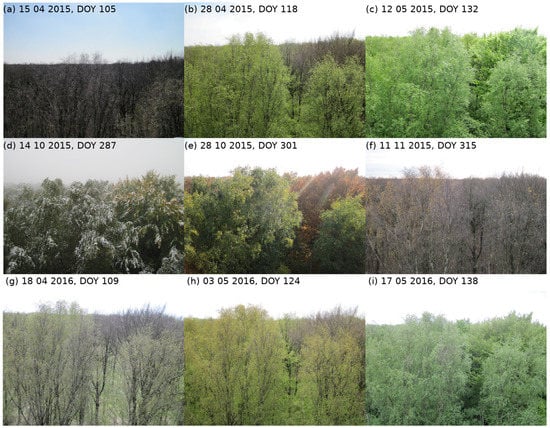 Pictures of phenological state of vegetation around the eddy flux tower ‘Hohes Holz’. (a–i) are captured at different dates, ranging from 15 April 2015–17 June 2016. (a–c) show the green-up period in 2015, (d–f) the senescence period of 2015 and (g–i) the green-up period of 2016.