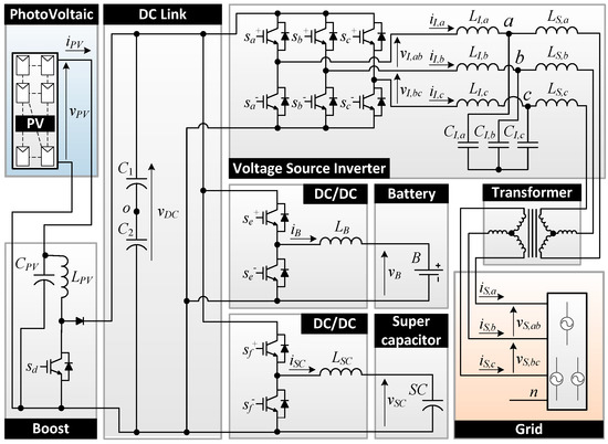 The topology selected for the photovoltaic inverter with battery-supercapacitor HESS consists of four converters that share the DC link. It is composed by a boost stage for the PV source for solving MPPT, two bidirectional DC/DC converters for both ESS, the battery and the supercapacitor, for maintaining a DC link voltage, and a traditional 3-phase inverter for injecting a reference power into the grid. A transformer or DC current injection detection must be added for avoiding DC current injection into the grid. Figure 2 shows the scheme of the topology, which contains all the electrical variables used in subsequent sections.