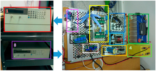Picture of the prototype ((1) HP E4351B Solar Array Simulator, (2) Boost converter filter, (3) two Fuji IGBT-IPM 6MBP50RA120 power stage, (4) Li-ion batteries, (5) Maxwell BMOD0165 P048 B01 supercapacitor, (6) ESS converters filters, (7) inverter filter, (8) HP 6834B Power Source/Analyzer, (9) STM32F407 microcontroller based control board, (10) LV 25-P voltage sensors, (11) LA 55P/SP1 current sensors).