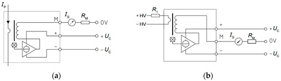 Hall effect transducers schematic: (a) LA 55P/SP1 current transducer; (b) LV 25-P voltage transducer.
