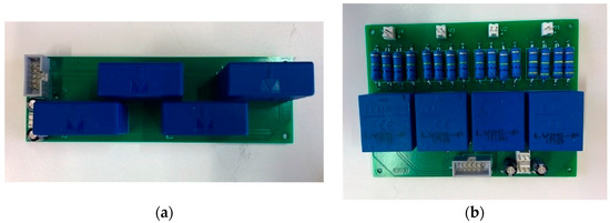 Sensors printed circuit boards for the experimental setup for measuring current and voltage magnitudes: (a) current sensors board and (b) voltage sensor board.