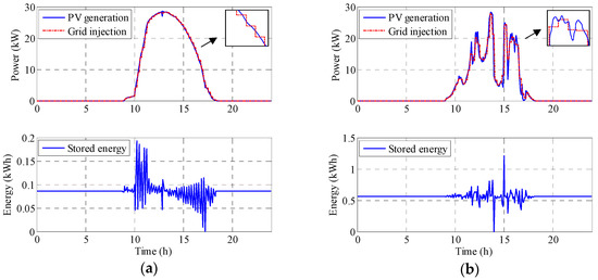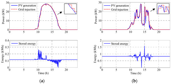 PV power generation, PV power injected into the grid (obtained from the PV power generation at the end of the previous 15-min interval) and the energy stored: (a) for a sunny day and (b) for a cloudy day.