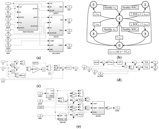 Control logic: (a) full scheme, (b) state machine, (c) MPPT, (d) HESS diagram and (e) dq diagram.