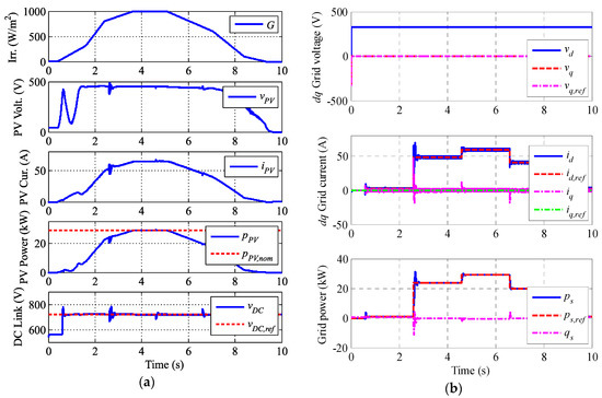 Simulation results. (a) Irradiance, PV output voltage; PV output current, PV output power and DC link voltage, (b) Voltage and current in the dq frame and power injected into the grid and (c) Grid voltage, inverter currents and grid currents.