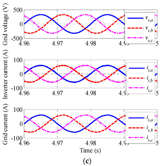 The inverter control diagram is shown in Figure 8e. It is based on the direct-quadrature theory, where the phase-neutral grid voltages, vabc, and currents, iabc, are transformed into the dq voltages, vdq, and currents, idq, components for and easier current control [38]. The Phase Locked Loop (PLL) synchronizes with the fundamental positive sequence component of the grid voltage [39]. The d current reference is directly obtained by the grid power reference generated in the state machine. The q current reference is set to zero for null grid reactive power injection. Inverter reference voltages are obtained in the dq frame by using a feed forward scheme, which decouples d and q terms: