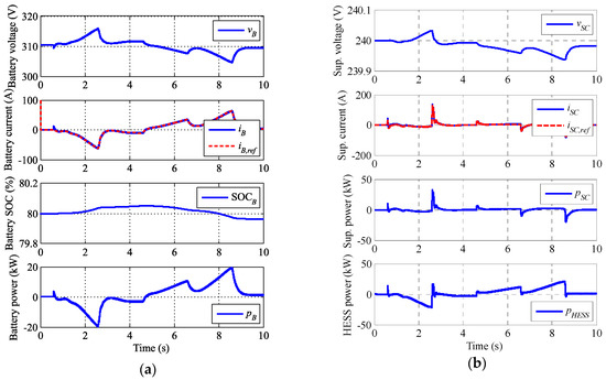Simulation results: (a) Battery magnitudes and (b) supercapacitor magnitudes and HESS power.