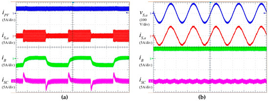 Experimental results. (a) PV current, grid current, battery and supercapacitor current for a cyclic injected power reference operation. (b) Grid voltage, grid current, battery and supercapacitor current for steady state operation.