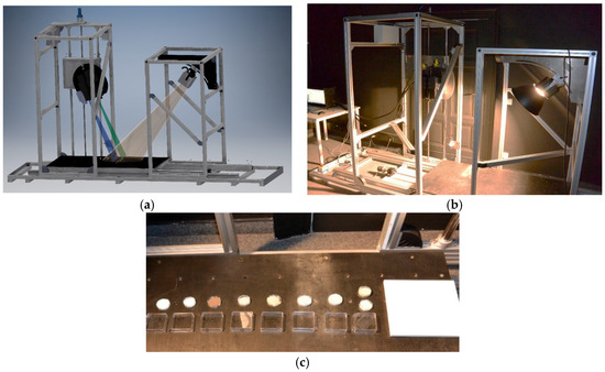 Translational imaging spectroscopy in the laboratory and the (a) CAD model, (b) experimental setup and (c) arrangement of the samples.